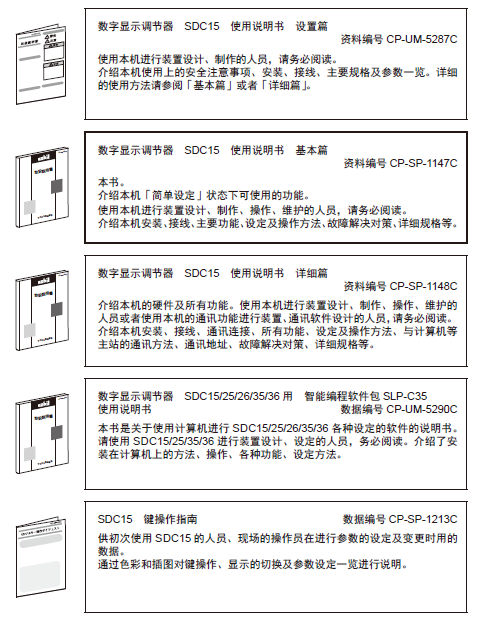 與數(shù)字顯示調(diào)節(jié)器 SDC15(以下簡稱本機(jī))相關(guān)的使用說明書共有 5 冊,請根據(jù)用途參閱相關(guān)說明書。如果您手中無相關(guān)的使用說明書時,請向本公司或代理店索取。
